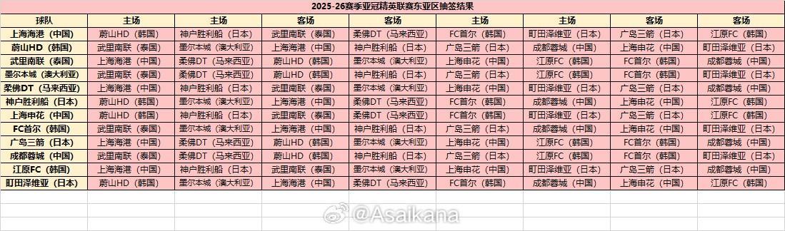 2025-26赛季亚冠精英联赛东亚区抽签结果