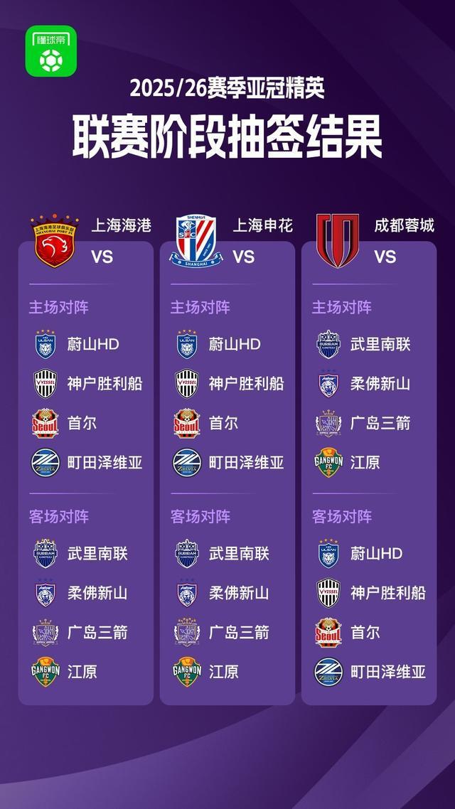 北京时间8月15日,2025-26赛季亚冠精英联赛抽签结果出炉。代表中超出战的上海海港和上海申花主客场对阵的球队完全相同,而成都蓉城的主客场对手正好相反。
