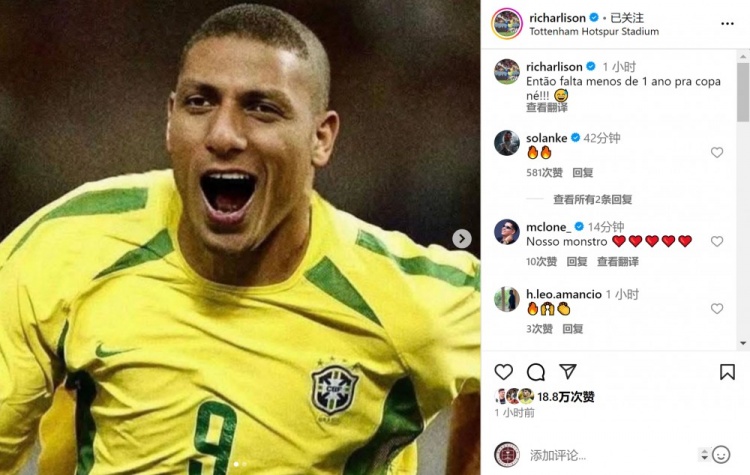 理查利森赛后更新社媒动态,晒出将身穿巴西9号的阿福头大罗P成自己的照片,配文:“那么离世界杯还有不到一年了,对吧!”